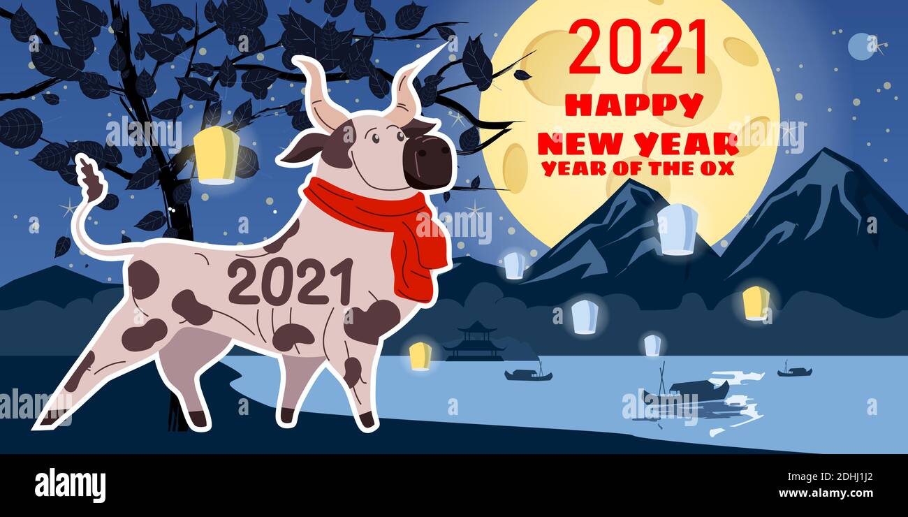 Chinese New Year 2021 Background Landscape , Chinese Translation Ox Vector Illustration.